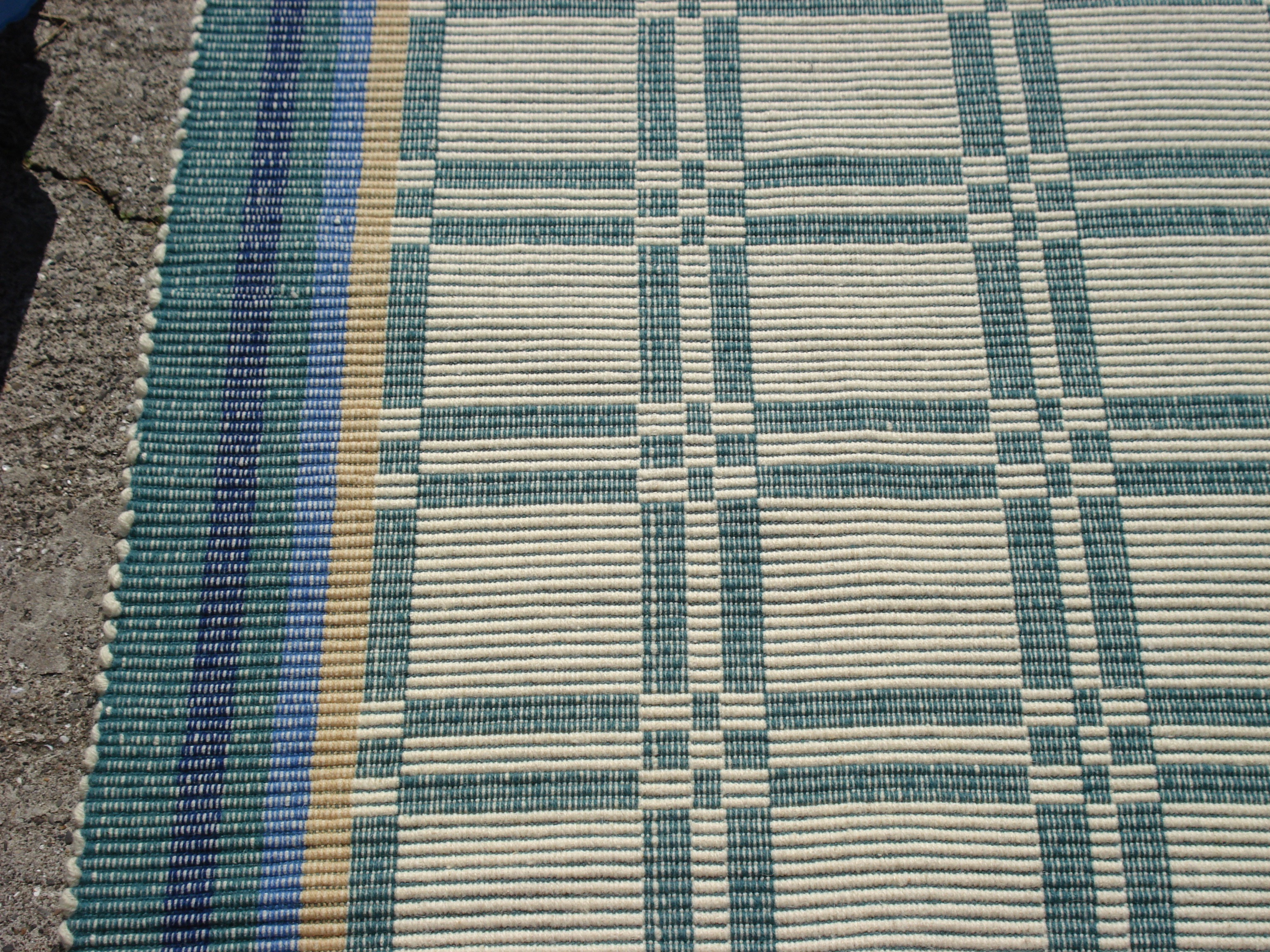 Warp-faced repp weave rug showing the predominantly white side of the weave, The two sides of warp-faced weaves are the opposite to each other. The edges were sewn in to avoid fringes. Sometimes this gives a crisper edge. Measures 120cms x 190 cms.