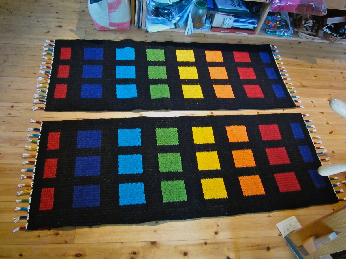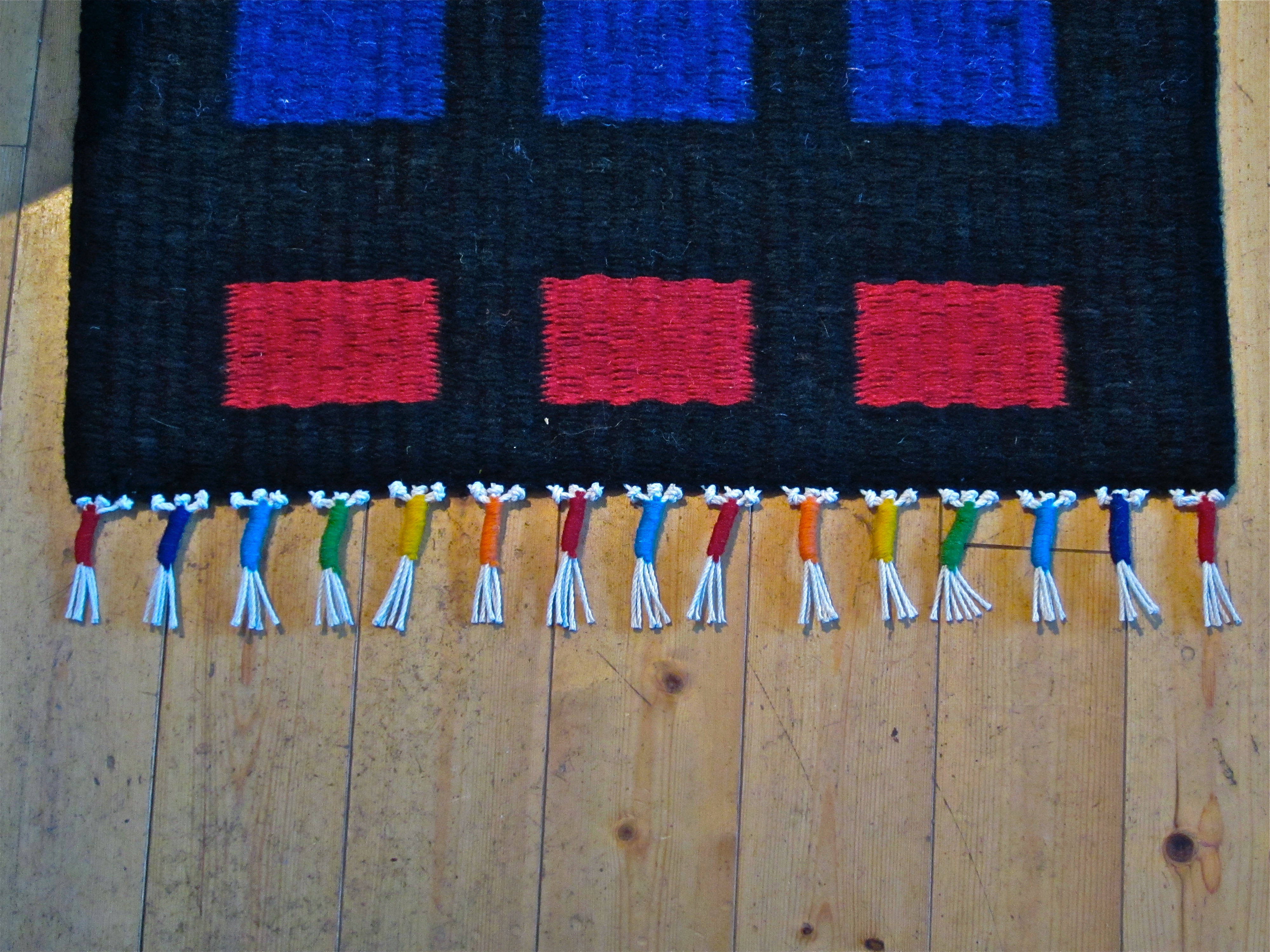 This small woollen block-weave runner (on a linen warp) can be used either for a table, a floor, or as a hanging. I also work with stained glass, which inspires some of the more graphic side of my work. Measures 53 cms x 140 cms. The fringe was plaited and whipped to avoid bulky knots and reflect the colours in the windows.
