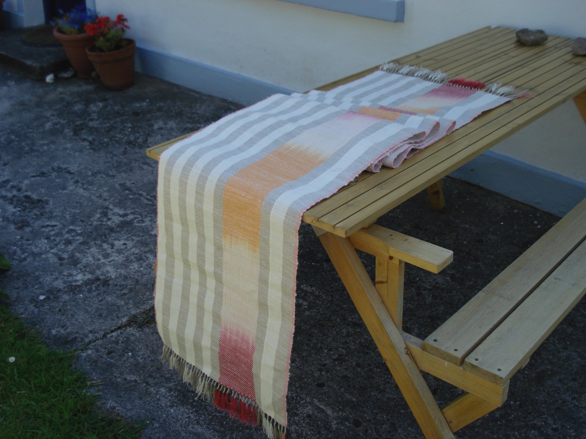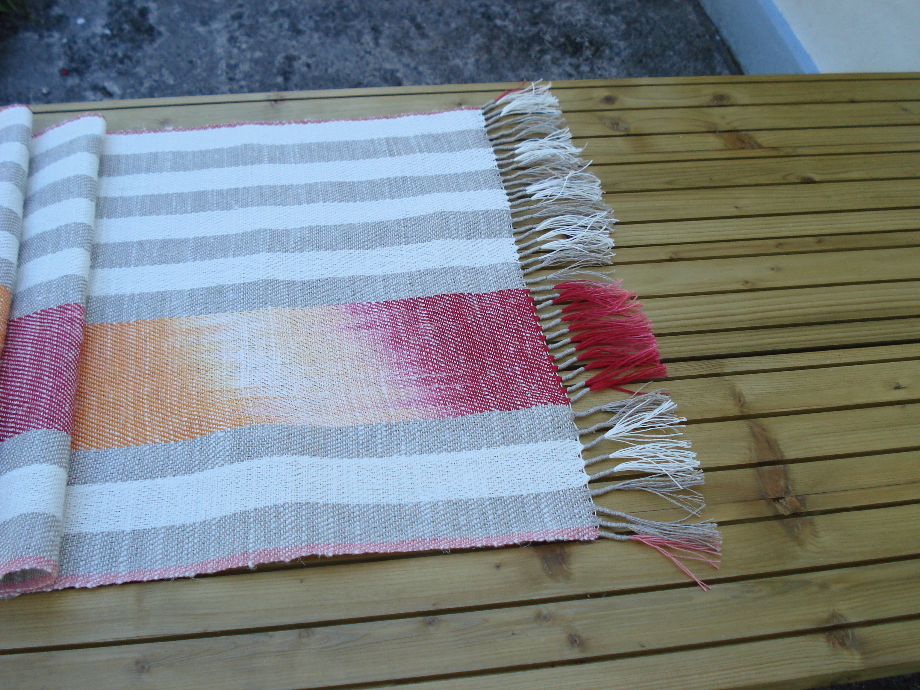 Linen Table Runner Linen table runner with a central ikat dyed panel. Whipped ends. Measures 360 cms x 45 cms. Click on image to enlarge.