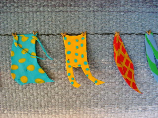 Many times inspiration comes from something someone has said. This hanging is woven with wool and the clothes are made from fimo and attached to the washing line by stitching to depict the pegs. It is intending to be light-hearted and uplifting. The close-up images are to show the clothes more clearly against the woven background. Measures 84cms x 46 cms, mounted on board to support hanging.