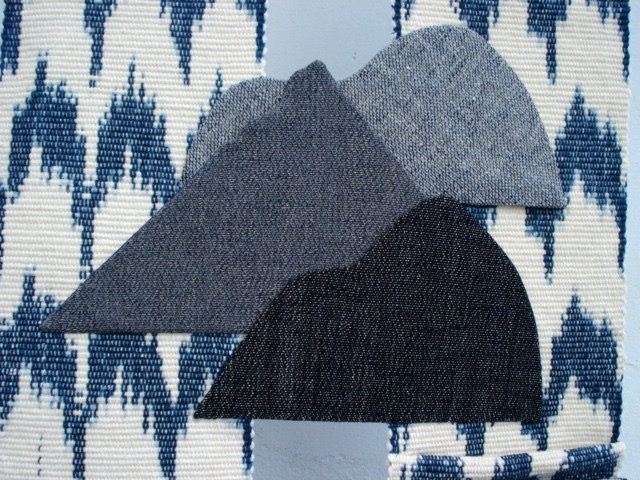 The two ikat panels, representing the sea and waves, are hanging from a steel rod. I wove 3 different cloths to be able to superimpose the mountains onto the panels. I am originally from Northern Ireland. Next to Kerry, I am impressed by mountains, that seem as if they just sweep down and disappear into the water. It reminds me of the connectedness of hills and sea. Measures 60 x 110cms.