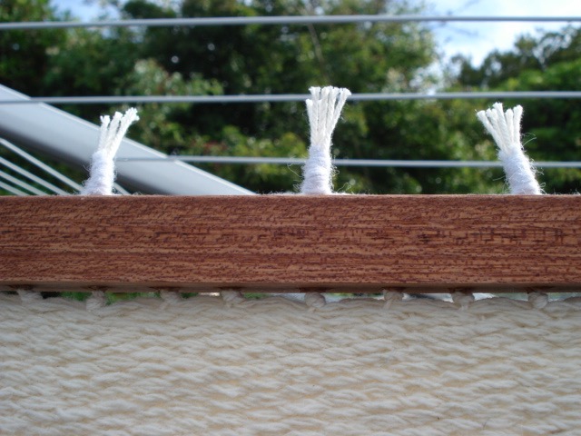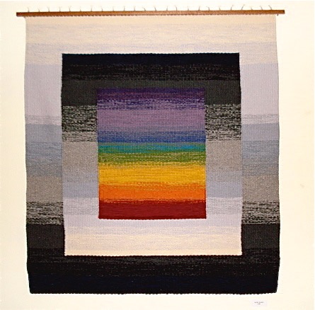 On a showery but sunny day, at any point in time, you will get a rainbow amidst a dark grey sky that is slowing changing to grey and blue. The rainbow is the sign of hope that the weather can change for the better. Sometimes it plays tricks with us and we don’t know if the bad weather is coming or going, which is why I use the effect of the upside down skies. Measures 130 x 145cms. The second thumbnail shows how the hanging is hung by taking the warp ends through a stick to ensure evenness of hanging.