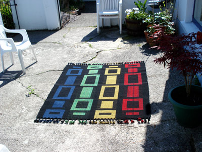 I have a variety of looms, but the one I use most weaves to a maximum of 160 centimetres width, but an infinite length. Floor rugs are woven generally with a strong cotton warp and I use an Axminster wool yarn in the weft for durability and quality. Most all designs have the capacity to be used on both sides, thus increasing the life of a rug. Many rugs I have designed to be used on the floor have instead been used as wall-hangings, so a deal of imagination is needed when viewing them.
