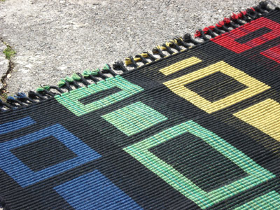100% wool warp-faced rug. Measures 140 cms x 210 cms. The ends are whipped with the colours reflected in the whipping yarn. Using black is not a popular choice for most people, but I find it very dynamic on some of today’s floor surfaces. The warp-faced repp technique gives a textured, rigged effect. The double-sided feature of warp-faced rugs means that the opposite is happening on the other side.